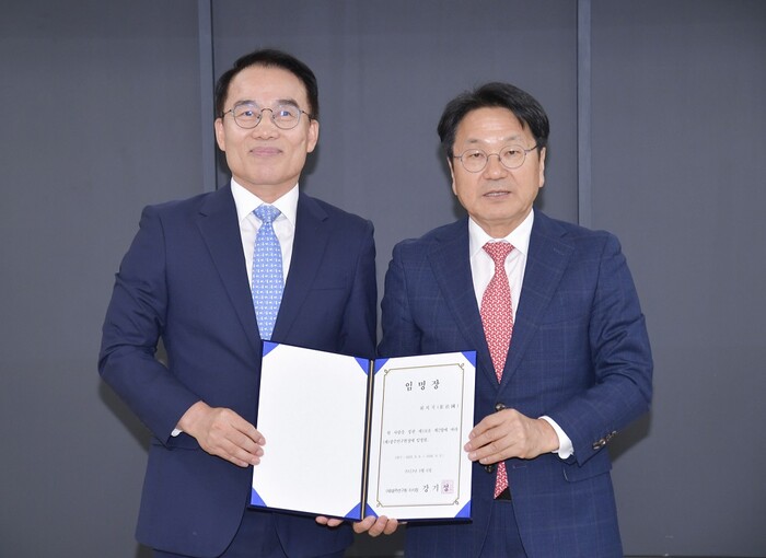 | ▲ 강기정 광주광역시장(오른쪽)이 6일 오후 광산구 진곡산단 옛 그린카진흥원에서 열린 (재)광주연구원 이사회에 참석해 초대 최치국 원장에게 임명장을 수여하고 기념촬영을 하고 있다./광주광역시 제공 |