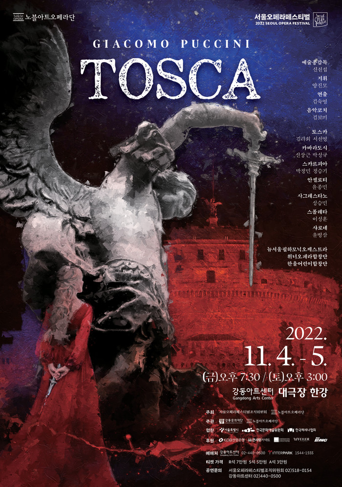 오페라 <토스카>는 작곡가 푸치니의 3대 오페라 중 하나로, 하룻밤 사이 펼쳐지는 치정과 격정의 드라마다. 대한민국을 대표하는 예술감독 신선섭을 필두로 지휘 양진모, 연출 김숙영, 토스카 역에 서선영과 김라희, 카바라도시역에 신상근과 박성규, 스카르피아 역에 정승기, 박정민 등이 무대에 올라 토스카의 유명 아리아로 관객들에게 벅찬 감동을 안겨줄 예정이다.