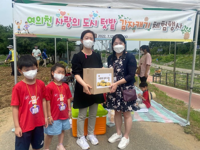 서울 서초구는 최근 ‘여의천 사랑의 도시텃밭’에서 지역내 어린이집 아이들과 함께 감자를 수확하는 행사를 진행했다. 이날 수확한 감자는 100% 친환경 감자로, 수확량은 300kg에 이르며 지역내 장애인복지관 및 복지시설에 전달한다. 사진은 이날 여의천 사랑의 도시텃밭에서 수확한 감자를 전달하는 모습. (사진제공=서초구청)