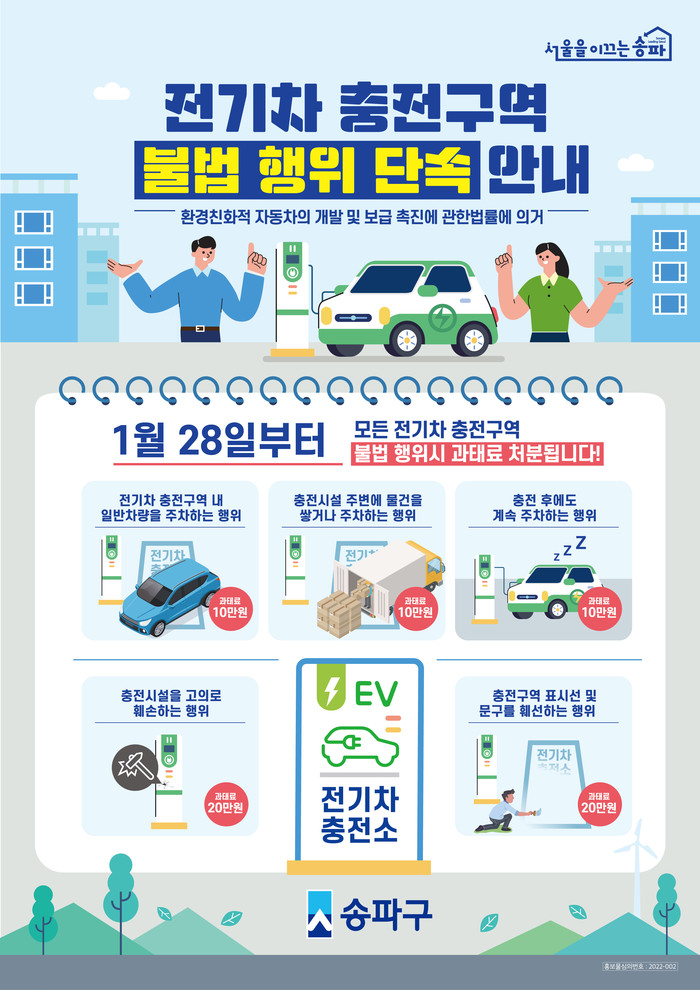 [시민일보 = 이대우 기자] 서울 송파구(구청장 박성수)가 전기자동차 전용 충전구역에서 발생하는 충전방해 행위에 대해 대대적인 단속 및 행정처분에 나선다고 9일 밝혔다.
