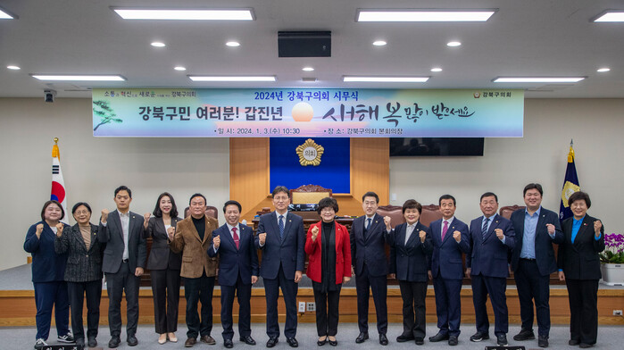최 의장은 시무식 신년 인사에서 "지난 해 우리 의회가 대의기관으로서 맡은 바 소임을 다할 수 있도록 아낌없는 성원과 격려를 보내주신 구민 여러분께 깊이 감사드린다"며 "2024년 강북구의회는 강북구의 숨은 잠재력을 발굴하고 발전 역량을 강화할 수 있는 정책제안으로 괄목할 만한 성장을 견인하는 '능력있는 의회', 출생부터 영유아, 어린이, 청소년, 청년, 중장년, 노년에 이르기까지 어느 한 세대도 소홀함이 없이 살펴 강북구에서 평생 동안 행복한 삶을 영위하도록 '모든 세대를 아우르는 의회'가 되겠다"고 힘찬 새해 포부를 밝혔다.