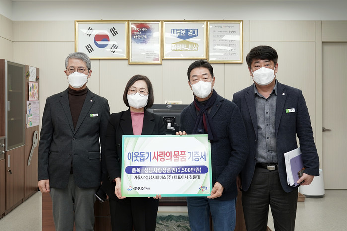 시는 이날 오후 3시 시청 시장 집무실에서 은수미 성남시장과 김윤태 성남시내버스㈜ 대표이사 등이 참석한 가운데 ‘이웃돕기 사랑의 물품 기증식’을 했다.