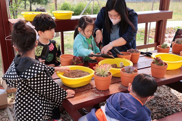 전남 구례군 백두대간생태교육장에서는 ‘반려식물 심기’ 체험을 실시하고 있다. 사진은 최근 한 어린이가 야외 ‘생태학습장’에서 흙을 채우고 식물을 조심스럽게 옮기고 있는 모습.(사진제공=구례군청)