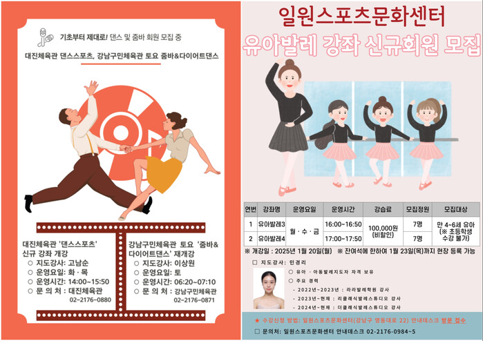 또한, 공단은 그동안 강사 퇴직으로 휴강 중이던 일원스포츠문화센터 만 4~6살 유아를 위한 발레 강좌(월·수·금요일 16시, 17시), 강남구민체육관 줌바&다이어트댄스 강좌(토요일 06시 20분) 강좌를 재개강한다(문의처 : 일원스포츠문화센, 강남구민체육관).