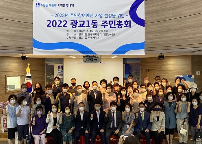 경기 수원시 영통구 광교1동 주민자치회는 최근 주민총회를 개최했다. 주민총회에서는 광교1동 주민참여예산 사업 추진상황 보고와 2023년 주민참여예산 사업 제안자 발표를 통해 주민들의 의견을 직접 경청했으며, 주민참여예산 사업의 우선순위 결정을 위한 현장투표도 실시했다. 사진은 주민총회 참석자들이 기념촬영을 하는 모습. (사진제공=영통구청)