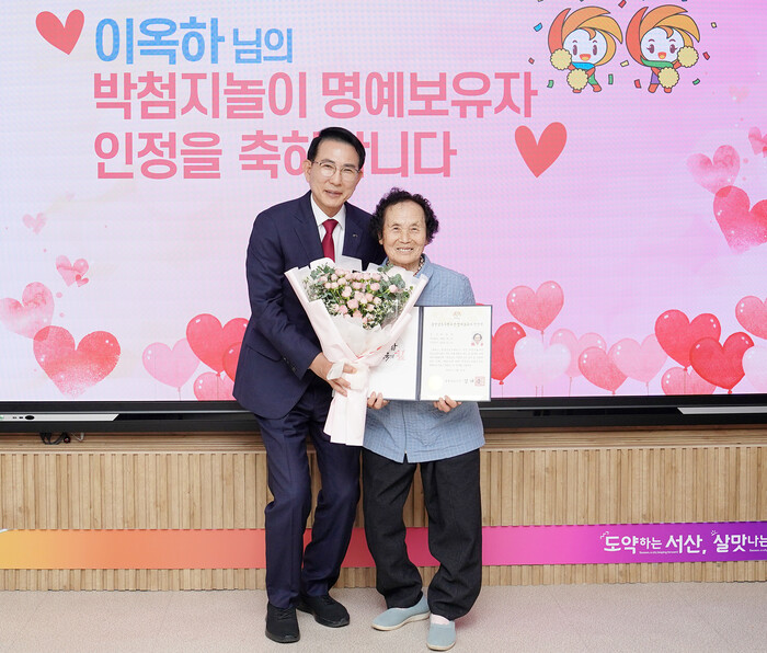 [서산=최복규 기자] 충남 서산시는 7일 시청 시장실에서 ‘서산 박첨지놀이’ 명예보유자 인정서를 이옥하씨에게 수여했다고 밝혔다.