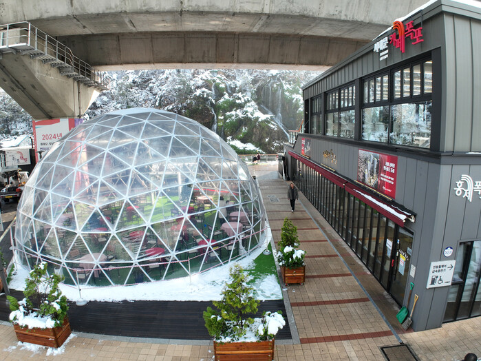 한편 구는 최근 카페폭포 앞에 추위를 막아 주는 대형 돔(사진)을 설치해 겨울철 명소로 많은 인기를 모을 전망이다.