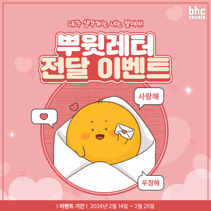 bhc치킨은 '설날 3ㅔ배(세배) 이벤트'에 이어, 밸런타인데이 시즌을 맞아 사랑과 감사의 마음을 전할 수 있는 '뿌윗레터’ 이벤트를 오는 25일까지 공식 인스타그램을 통해 진행한다고 14일 밝혔다.