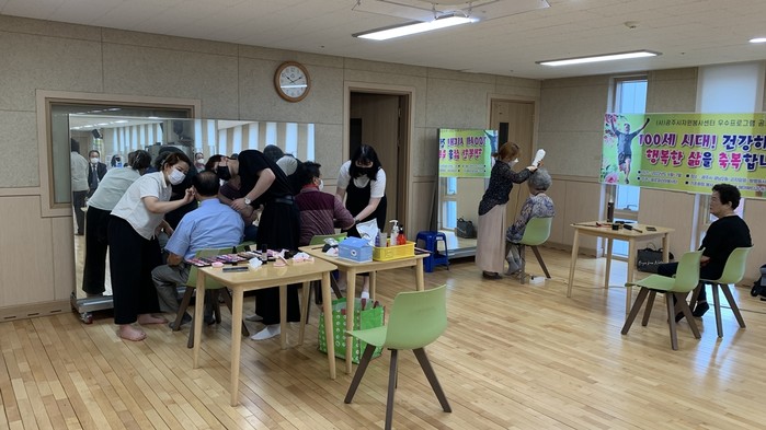 경기 광주시 경안동·쌍령동 지역사회보장협의체는 최근 필로칼리아봉사단과 동원대학교 헤어뷰티과 학생들, 스튜디오 사진작가의 재능 기부로 지역내 노인 24명을 대상으로 무료 장수 사진 촬영을 진행했다. 사진은 이날 대상 노인들이 장수 사진 촬영을 준비하고 있는 모습. (사진제공=광주시청)