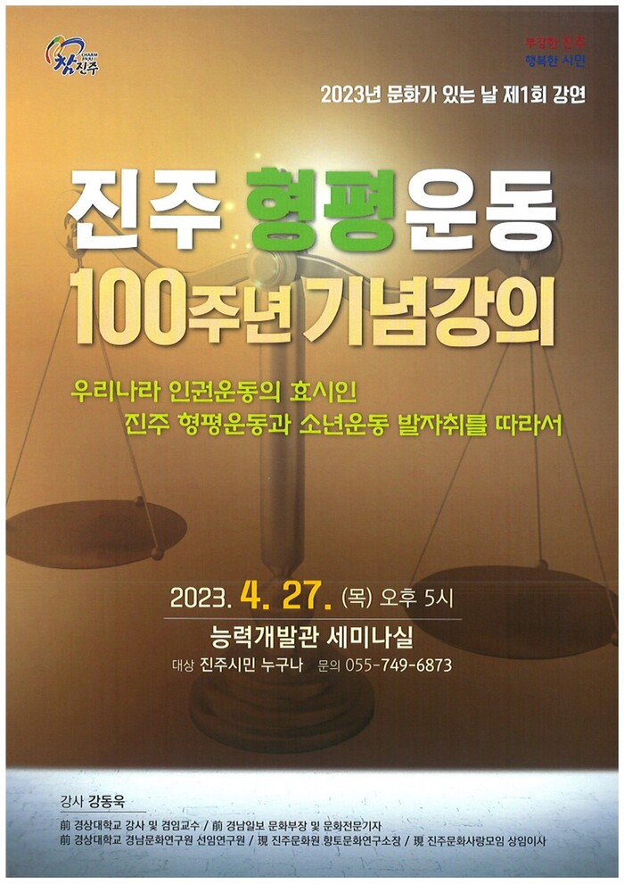 이번 강연은 진주 형평운동 100주년을 맞이하여 진주문화원 향토문화연구소장 강동욱 문학박사를 초빙해 진주 형평운동의 의미와 오늘날 우리가 계승해야 할 교훈을 다룰 예정이다.
