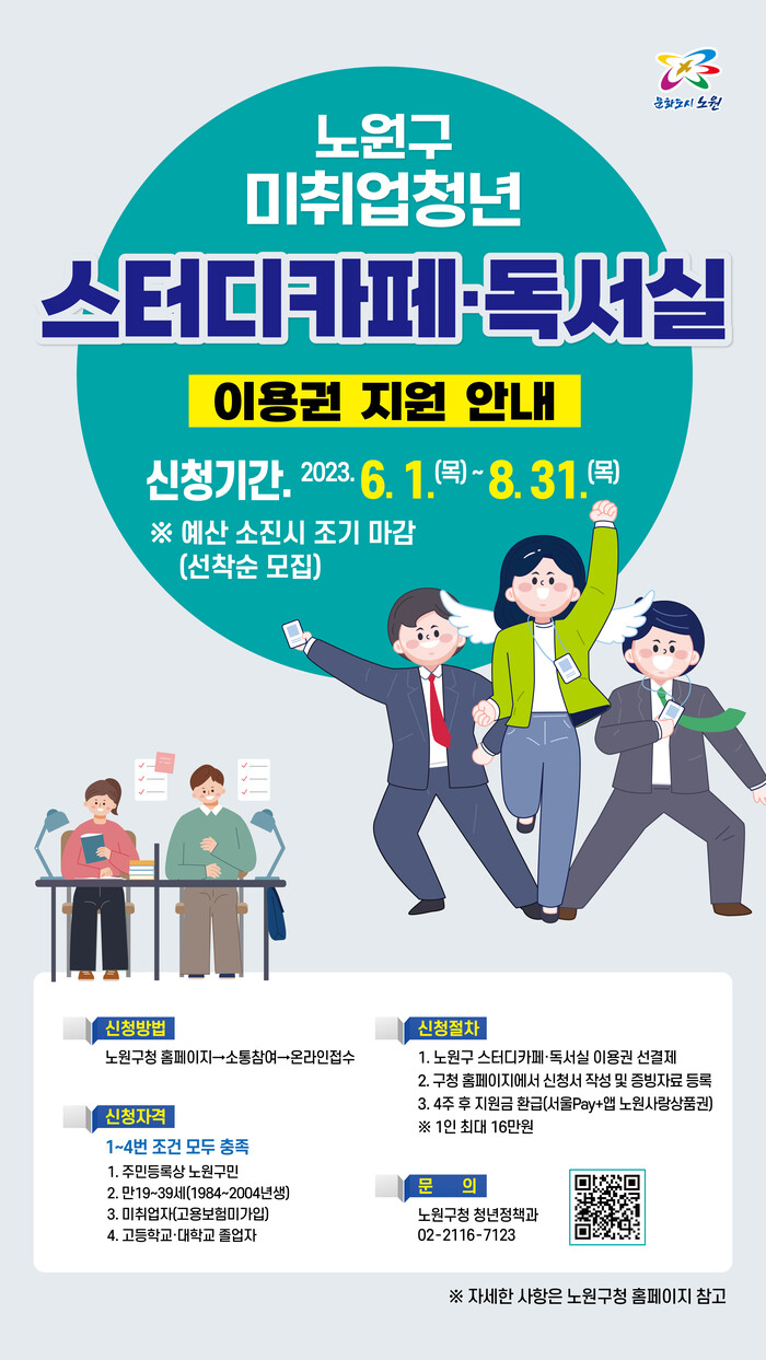 [시민일보 = 홍덕표 기자] 서울 노원구(구청장 오승록)는 청년들의 취업준비 비용을 지원하기 위해 '스터디카페·독서실 이용권 지원사업'을 추진한다고 2일 밝혔다.