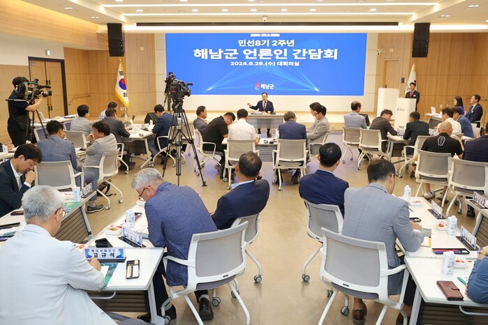 전남 해남군은 26일 군청 대회의실에서 민선8기 2주년 언론인 간담회를 갖고, 전반기 성과를 돌아보고, 앞으로 군정발전 방향과 비전을 설명하는 대화의 시간을 가졌다.