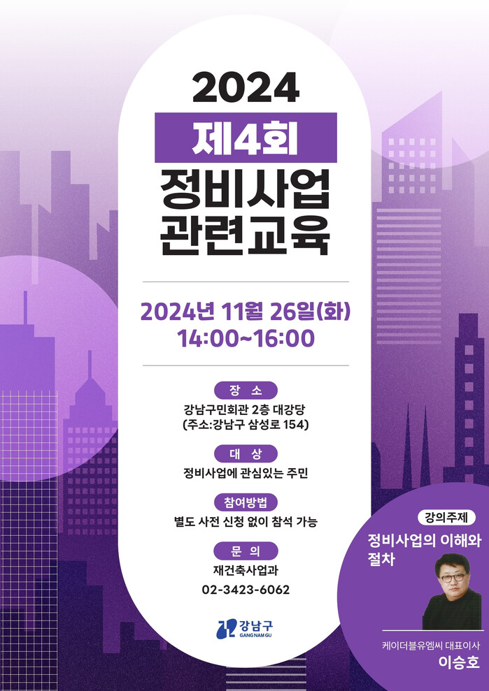[시민일보 = 이대우 기자] 꿈이 모이는 도시, 미래를 그리는 강남구(구청장 조성명)가 오는 11월 26일 오후 2시부터 4시까지 구민회관 대강당에서 주민 300여 명을 대상으로 제4회 재건축 정비사업 아카데미를 개최한다.