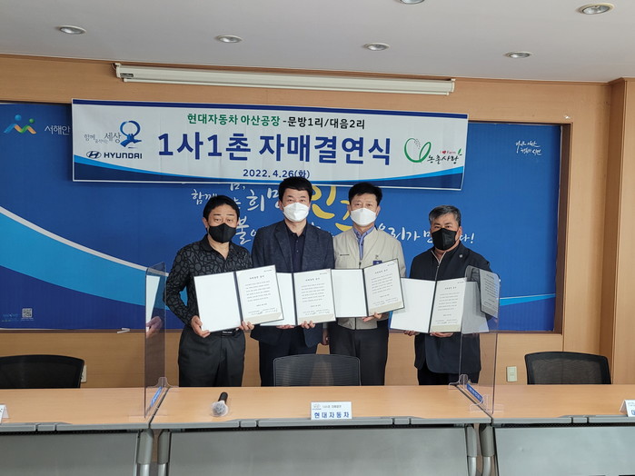 충남 아산시 인주면 문방1리와 대음2리는 현대차 아산공장과 최근 1사 1촌 결연식을 개최했다. 결연을 통해 현대차 아산공장은 결연 대상 마을에 마을 발전기금을 전달하고 농촌일손돕기, 농산물 직거래장터 개설 등 다양한 지원활동을 전개하기로 했다. 사진은 이날 결연식에서 관계자들이 기념촬영을 하는 모습. (사진제공=아산시청)