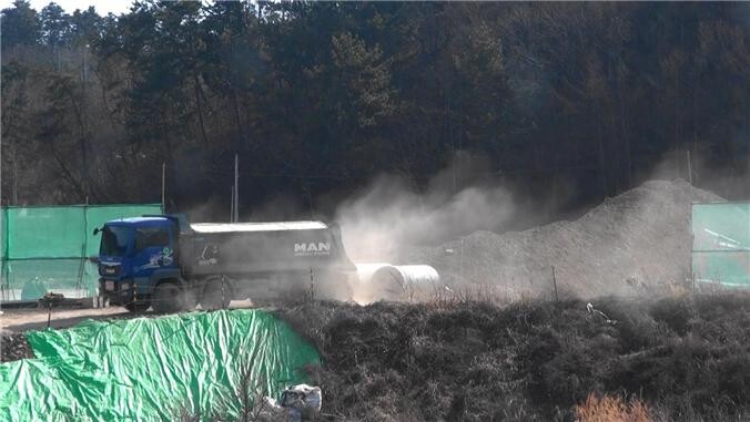 | ▲ 공사장에서 세륜 및 측면살수를 하지 아니하고 나오는 수송차량 |