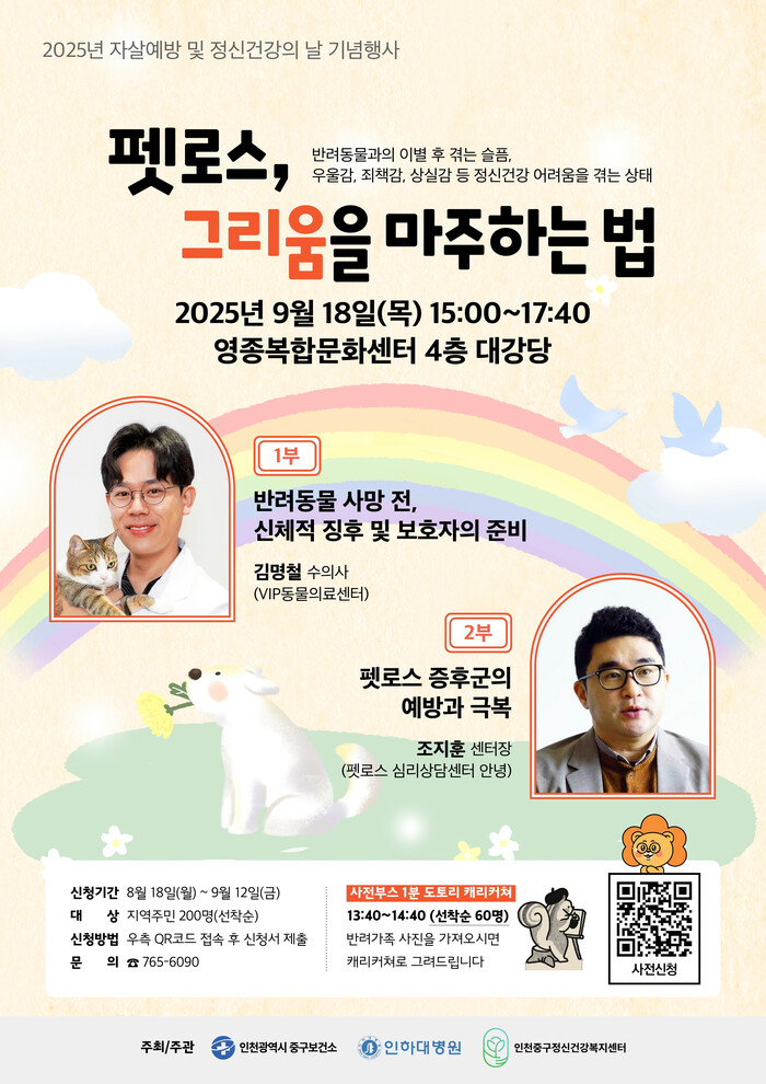 배재남 인천중구정신건강복지센터장은 “정신건강은 개인의 행복뿐 아니라 지역사회의 건강한 미래를 위해 꼭 지켜야 할 가치”라며, “이번 강연이 반려동물과의 이별로 느끼는 깊은 슬픔을 조금이나마 덜어내고, 마음이 회복되는 시간이 되길 바란다”라고 말했다.