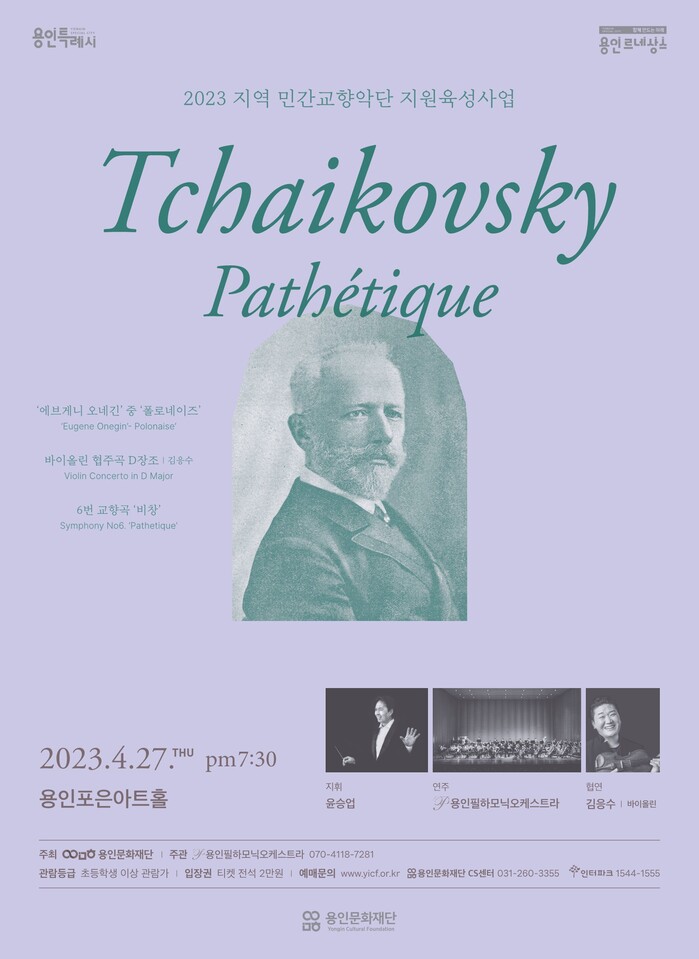 또한 4월 27일 공연인 ‘용인필하모닉 오케스트라’의 <차이코프스키-비창>은 용인에서 처음으로 시도된 마스터피스 교향곡 시리즈로 낭만주의 시대의 거장인 차이코프스키 작품들로 연주되며, 시민들에게 관현악의 세계를 알릴 예정이다. 한국 바이올린의 거장 김응수의 협연으로 생동감 넘치는 음악을 더해 풍성한 음악회가 될 것으로 기대를 모으고 있다.