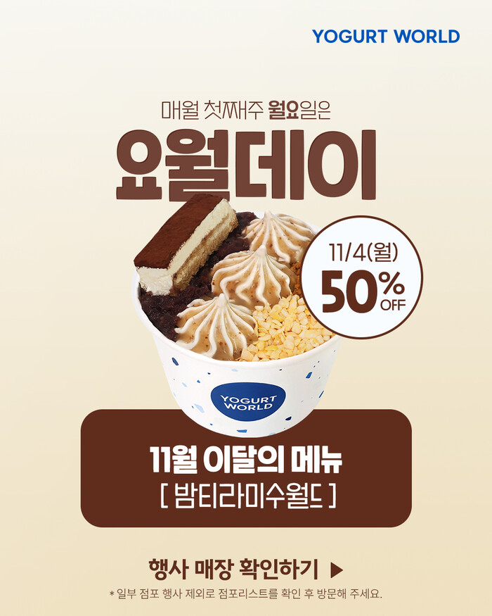 디저트 카페 프랜차이즈 요거트월드가 11월 4일, 매월 첫째 주 월요일마다 진행하는 할인 행사 '요월데이'를 진행한다.
