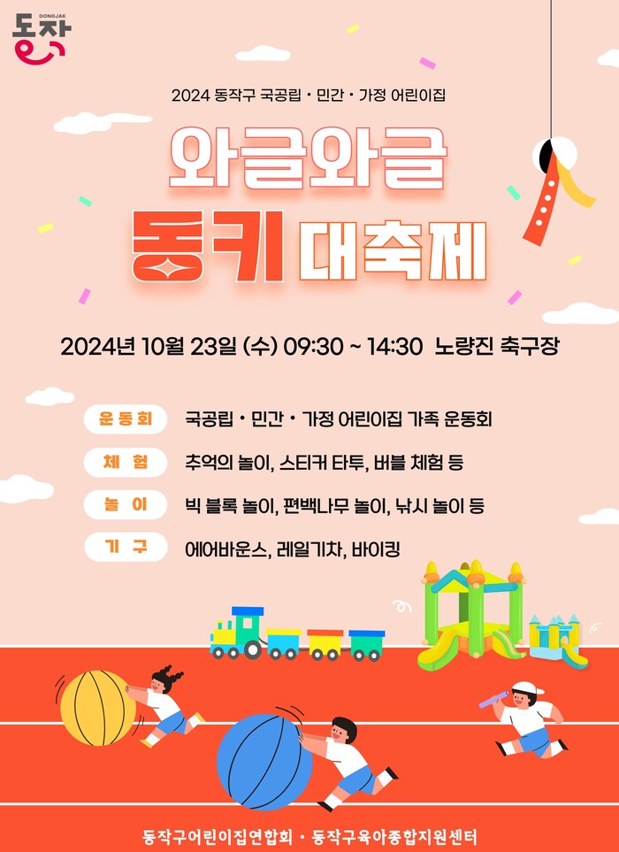 동작구육아종합지원센터와 동작구어린이집연합회 주관으로 열리는 이번 행사는 23일 오전 9시30분부터 오후 2시30분까지 진행되며, ▲가족 운동회 ▲놀이 및 체험 부스 등 다채로운 프로그램이 준비돼 있다.
