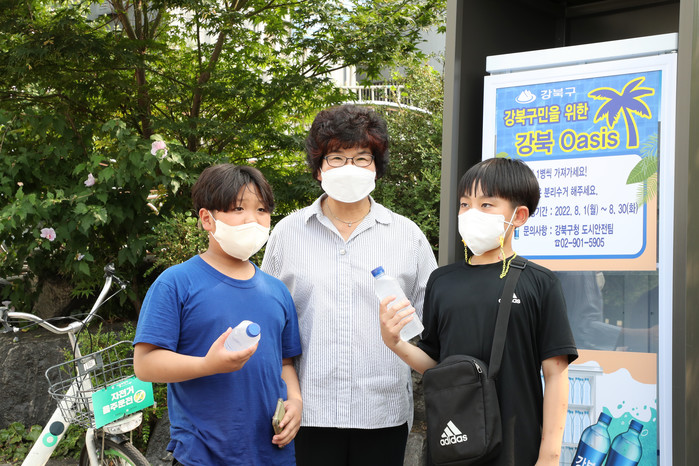 이에 구비 약 1억7000만원이 투입됐으며, 이달 말까지 우이천변 야외무더위쉼터 4곳(벌리교, 신창교, 우이교, 쌍문 414앞교)에 설치된 냉장고에서 매일 생수(500ml) 500병을 4차례씩, 총 8000병이 무료 제공된다.