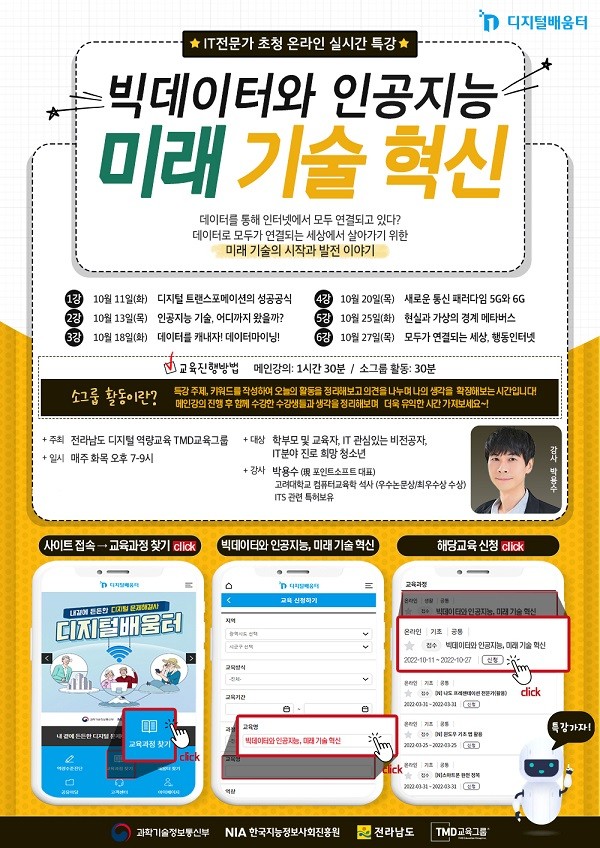 이번 온라인 특강에서는 IT 전문가를 초청해 빅데이터와 인공 지능에 대해 알아본다. 일상 에서는 물론 미래 기술에서 핵심이 된 빅데이터와 인공지능에 대해 강의한다.