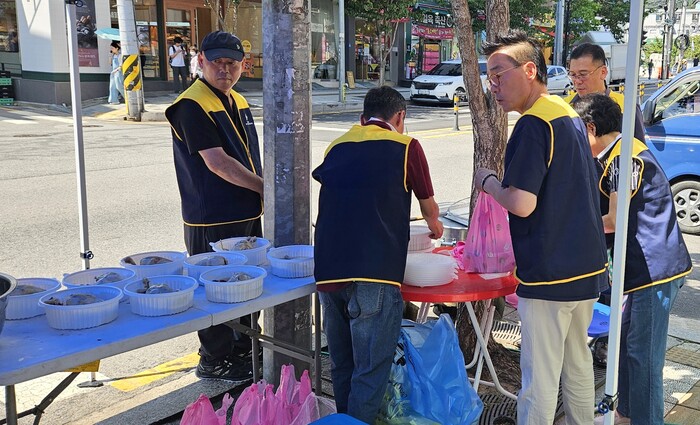 21일 구에 따르면 협의체 위원들은 이른 아침부터 모여 직접 구입한 닭과 재료를 손질하고 정성껏 삼계탕을 끓여 냈다. 또한 식사를 마치고 귀가하는 길에 김 한 박스씩을 전달했다.