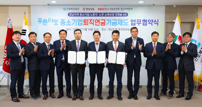 [창원=김점영 기자] 경남도가 14일 오전 도청 중앙회의실에서 저소득 노동자의 노후소득 보장 강화를 위해 ‘중소기업퇴직연금기금제도 도입 확산 업무협약’을 체결했다고 밝혔다.
