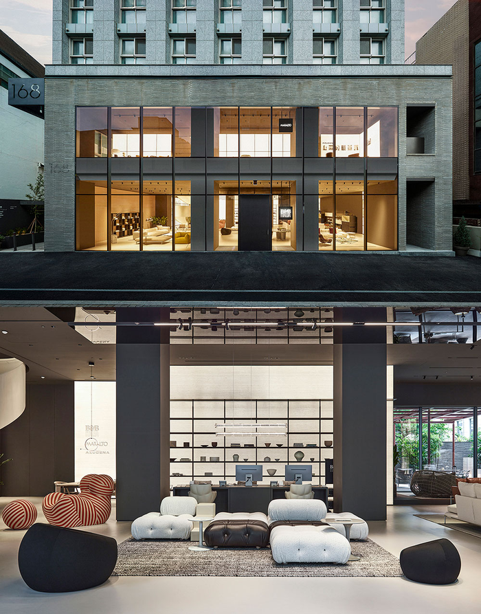 1층은 카멜레온다 소파와 세리업 암체어, 토비이시 테이블 등 비앤비 이탈리아의 아이코닉한 가구가 전시되며, 2층은 막살토(Maxalto)와 아주체나(Azucena) 브랜드를 만나볼 수 있다. 지하 1층은 비앤비 이탈리아 컨트랙트 전용 쇼룸으로, 호텔 스위트룸을 컨셉으로 한 공간이다. 침실과 드레스룸은 물론 엘리티크(Elitique), 플로림(Florim), 팔퍼(Falper), 토토(TOTO), 볼라(Vola) 등 프리미엄 욕실과 자재 브랜드를 더해 공간 디자인을 고민하는 전문가에게 맞춤형 인테리어 솔루션을 제공한다. 전 층에 플로스(Flos)의 조명을 설치해 각 공간의 분위기를 세련되게 완성한 것도 특징이다.