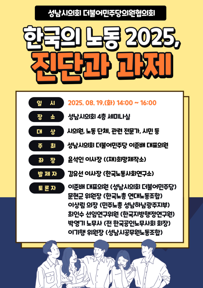 [성남=오왕석 기자] 성남시의회 더불어민주당의원협의회(대표의원 이준배)는 조정식 의원의 주도로 오는 19일(화) 오후 2시, 성남시의회 4층 세미나실에서 ‘한국의 노동 2025: 진단과 과제’ 토론회를 개최한다.