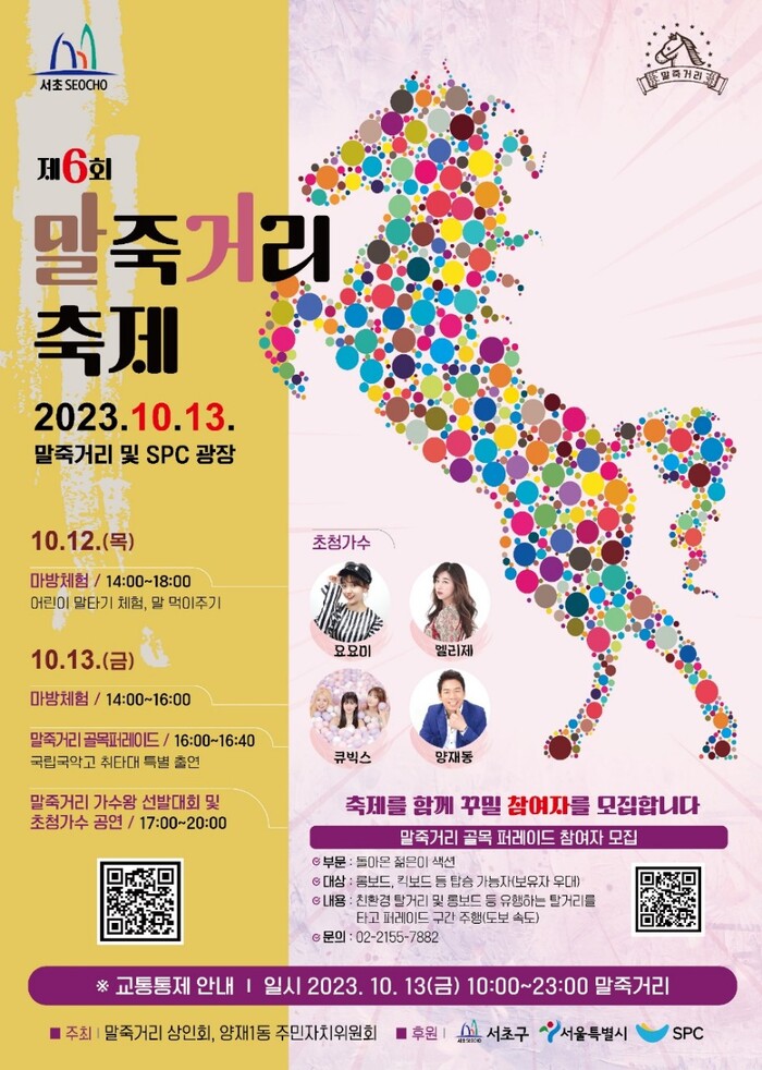오후 5시부터는 SPC 사옥 인근 공연무대에서 주민과 상인들이 어우러진 ‘말죽거리 가수왕 선발대회’와 트로트 가수 요요미와 엘리제, 큐빅스, 양재동 등 초청 가수 공연을 연다.