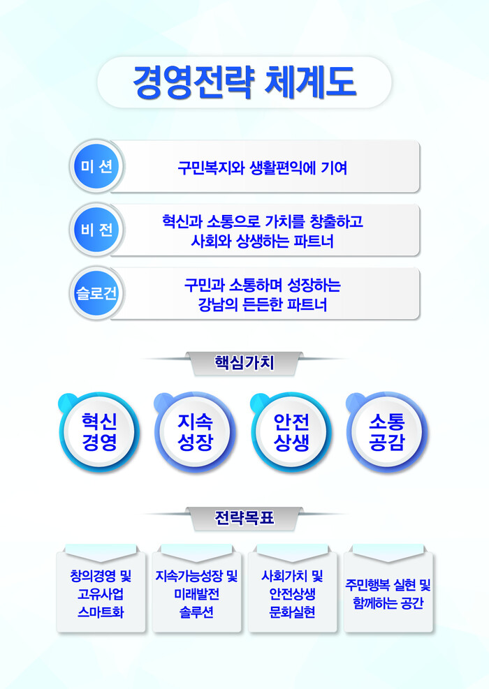 금년도 중장기 경영전략에는 특히 ‘구민과 소통하여 성장하는 강남의 든든한 파트너’라는 슬로건을 처음으로 도입하였으며, 4대 핵심가치, 4대 전략목표, 8개 전략과제, 19개 세부이행 과제를 전면 개정하여 新경영전략 체계를 정립하였다. 4대 핵심가치는‘혁신경영’,‘지속성장’,‘안전상생’,‘소통공감’이며, 특히 금번 경영전략에는 정부가 중점적으로 추진하는 사안인 ‘직무중심 인사 관리 도입’,‘디지털 기반 서비스 혁신’,‘데이터기반 업무 효율화’,‘지역 경제 활성화 노력’등이 반영되었다.