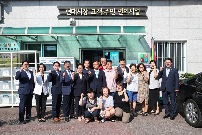 | ▲ 현대시장을 찾은 금천구의원들이 관계자들과 기념촬영을 하고 있다. (사진제공=금천구의회) |
