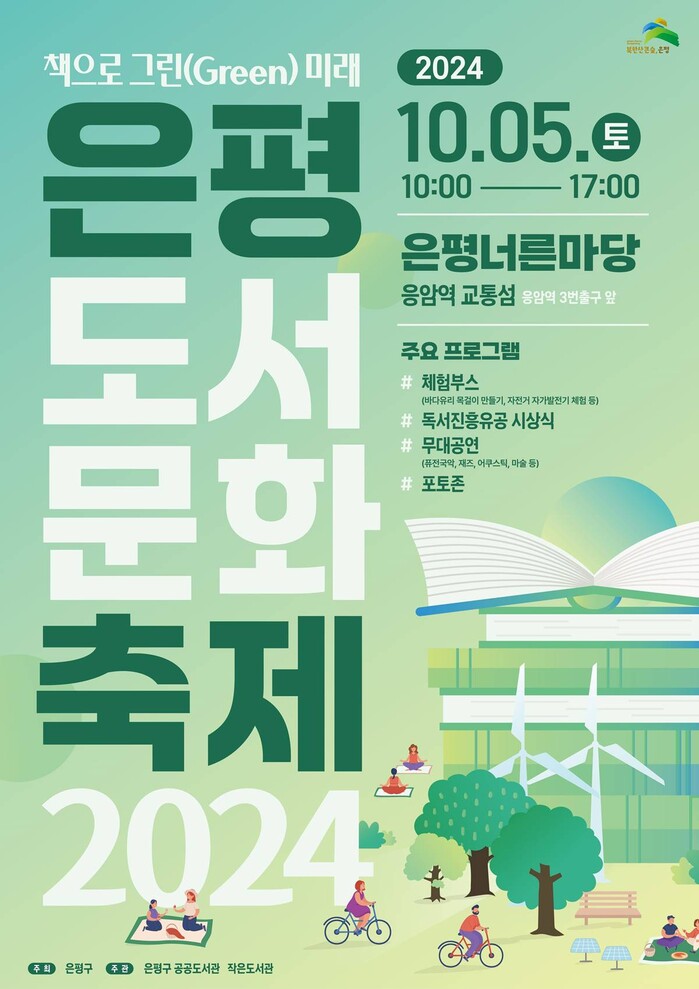 [시민일보 = 이대우 기자] 서울 은평구(구청장 김미경)가 오는 10월5일 ‘책으로 그린(Green) 미래’를 주제로 오전 10시~오후 5시 응암역 교통섬 은평너른마당에서 ‘2024년 은평도서문화축제’를 개최한다.