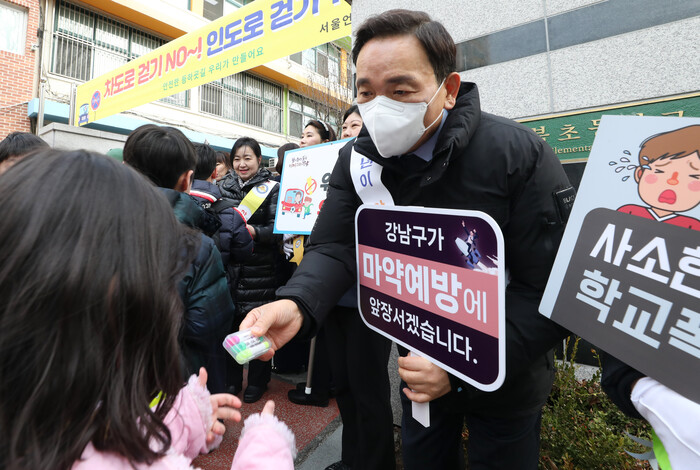 [시민일보 = 이대우 기자] 조성명 강남구청장이 지난 20일 오전 언북초등학교 정문 앞에서 ‘아동·청소년 범죄 예방을 위한 안전 등굣길 캠페인’을 진행했다.