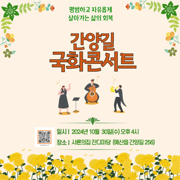 [예산=김의석 기자] 충남 예산군보건소는 오는 30일 오후 4시 정신재활시설 샤론의 집에서 ‘간양길 국화콘서트’를 개최한다고 밝혔다.