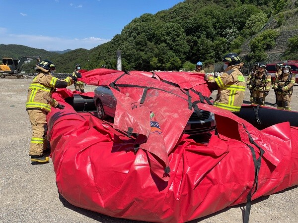 이번 전기차 화재진압훈련은 폐차를 활용하여 가상의 전기차 화재 진압을 실시하는 실전훈련이다. 1차로 화재가 발생한 전기차에 상방향 관창을 이용한 전기차 화재진압 및 주변 연소확대 방지를 위한 주수를 실시하고, 2차로 배터리 냉각 및 환경오염을 방지하기 위해 견인차로 생활폐기물매립장 등으로 견인하여 이동식 수조에 전기차 배터리를 침수하는 훈련이다.
