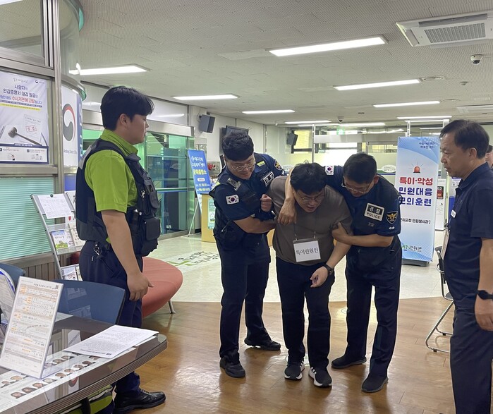 이번 훈련은 민원인의 폭언 및 폭행 발생 상황을 가정해 녹음·녹화 실시, 비상벨 호출, 보안업체·경찰서 출동, 악성 민원인 연행 순으로 진행됐다. 또한 읍면에서도 특이 민원 대응 모의훈련을 8월중 실시 예정이다.