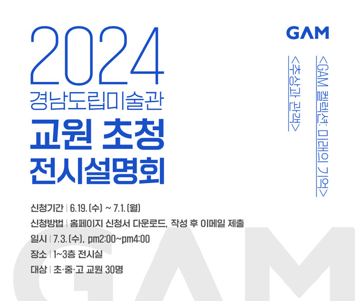 교원 초청 전시설명회는 경남도립미술관 개관 20주년을 기념하는 특별전 GAM 컬렉션: 미래의 기억, 추상과 관객, 실감영상-쪽빛 너머로 등 전시를 기획한 학예연구사가 직접 전시에 관해 설명하고, 미술교육과 관련한 질문을 받고 답하는 시간으로 구성됐다.