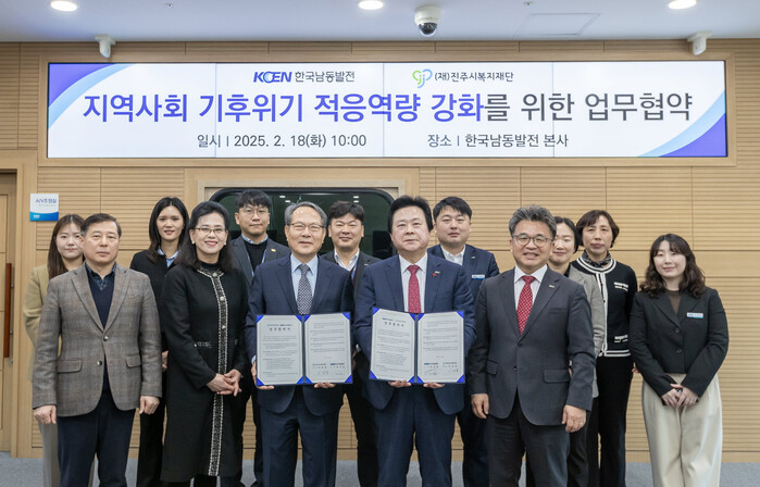 한국남동발전(주)(사장 강기윤)과 (재)진주시복지재단(이사장 이성갑)은 18일 한국남동발전 본사에서 지역사회 기후위기 대응 및 적응 역량 강화를 위한 업무협약을 체결했다.
