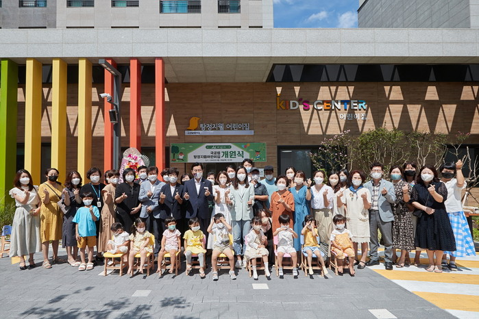 충남 아산시는 지난 18일 33번째 국공립어린이집인 탕정지웰어린이집을 개원했다. 시는 지난 4월 (주)신영아산탕정개발과 국공립 어린이집 20년 장기 무상 임대 협약을 체결한 후, 위탁운영자 선정과 리모델링 등을 거쳐 이날 탕정지웰어린이집을 개원하게 됐다. 사진은 개원식에서 박경귀 시장과 관계자들이 기념촬영을 하는 모습.(사진제공=아산시청)