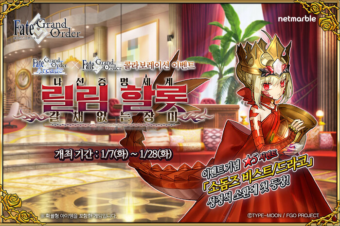 [시민일보 = 여영준 기자] 넷마블은 모바일 RPG <페이트/그랜드 오더>에서 <페이트/그랜드 오더 아케이드(Fate/Grand Order Arcade)>와의 콜라보레이션 이벤트를 오는 28일까지 진행한다고 7일 밝혔다.