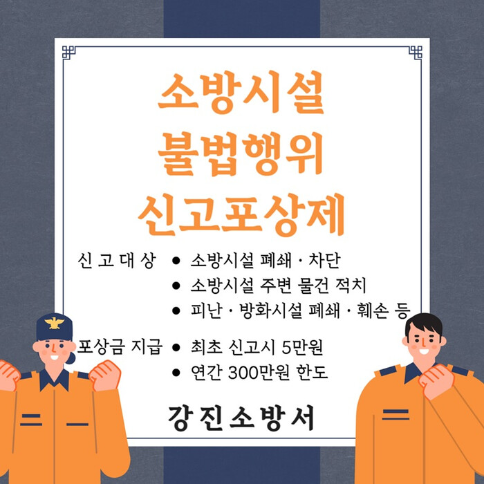 정용인 강진소방서장은 “화재 초기에는 소방시설과 피난통로의 역할이 생명과 직결된다”며, “군민 여러분께서 주변 불법행위를 적극 신고해 주신다면 화재로 인한 인명피해를 예방하는 데 큰 힘이 될 것”이라고 말했다.