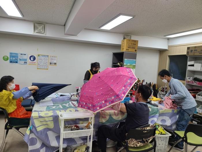 | ▲ 우산무상수리센터에서 지역공동체 일자리사업에 참여한 주민들이 우산을 수리하고 있다. (사진제공=동작구청) |