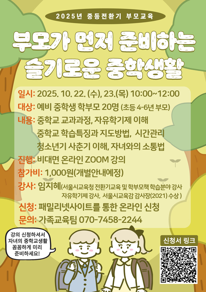 이번 교육은 예비 중학생 자녀를 둔 학부모 20명을 대상으로 10월 22일(수)과 23일(목) 오전 10시부터 12시까지 비대면 온라인(ZOOM) 방식으로 진행된다.