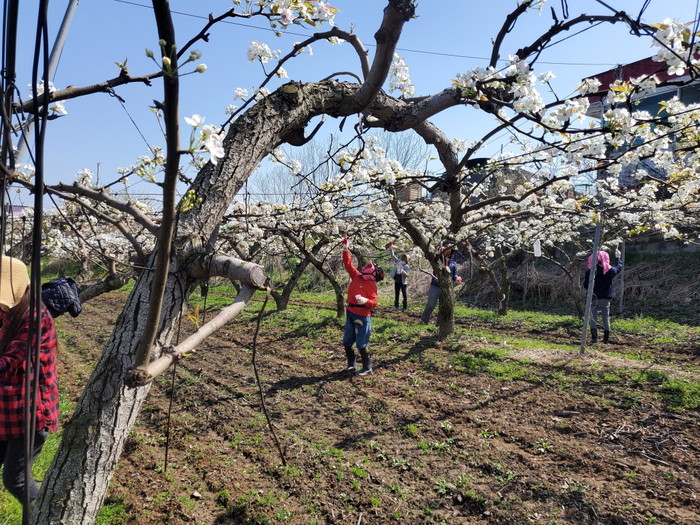 충남 아산시 온양5동이 영농철을 맞아 최근 지역내 배 농가를 방문해 배 화접 일손 돕기 봉사활동에 나섰다. 이날 최기호 온양5동장을 비롯한 직원과 통장 10여 명이 신인동 소재 배 농가를 방문해 배꽃 인공수분 작업을 진행했다. 사진은 참여자들이 인공수분 작업을 하고 있는 모습.(사진제공=아산시청)