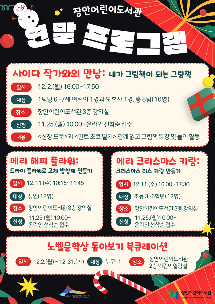 [시민일보 = 이대우 기자] 동대문문화재단(이사장 이필형) 장안어린이도서관이 연말을 맞아 지역 주민들을 위한 특별한 문화 예술 프로그램을 마련해 관심을 모은다. ‘메리 크리스마스 특별 프로그램’, ‘사이다 작가와의 만남’, ‘노벨문학상 톺아보기 북큐레이션’ 등 12월에 다채로운 행사가 펼쳐질 예정이다.