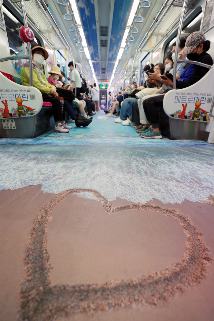 24일 부산 도시철도 2호선 열차가 시원한 백사장 이미지로 꾸며져 있다. 부산시대중교통시민기금은 23일부터 오는 9월까지 기존에 운행 중인 부산 시내버스 4대, 마을버스 2대, 도시철도 2량을 선별해 '부산 마린버스'와 '메트로 마린'을 운행한다고 밝혔다.