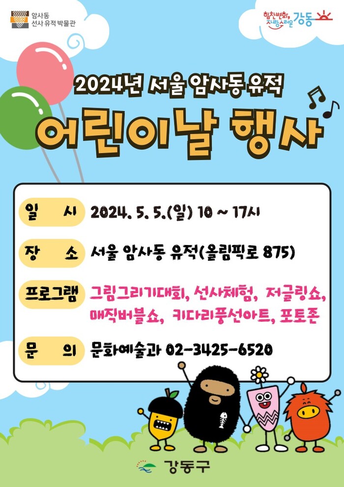 이선영 문화예술과장은 “아이들은 미래의 희망이자 오늘의 주인공”이라며 “가정의 달, 강동구에서 마련한 서울 암사동 유적 어린이날 행사에 오셔서 가족들과 함께 소중하고 특별한 추억을 만들고 가시길 바란다.”라고 전했다.