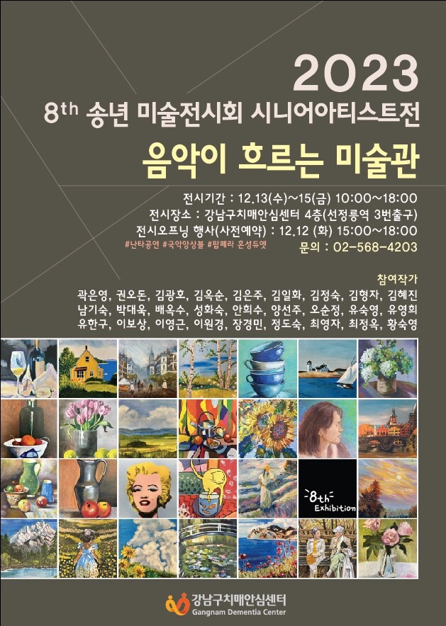 [시민일보 = 이대우 기자] 서울 강남구(구청장 조성명)가 12~15일 강남구치매안심센터 4층 전시실에서 시니어 아티스트전 ‘음악이 흐르는 미술관’을 개최한다.