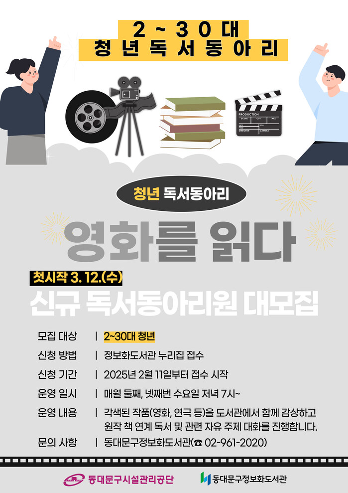 [시민일보 = 이대우 기자] 동대문구시설관리공단(이사장 인택환)이 운영하는 동대문구정보화도서관이 20~30대 청년들을 대상으로 새로운 독서동아리 ‘영화를 읽다’를 오는 3월부터 운영한다고 밝혔다. 이번 프로그램은 책과 영화를 매개로 한 소통의 장을 마련하여 청년들의 문화적 소양 증진과 사회적 관계 형성을 돕고자 기획됐다.
